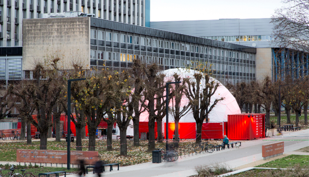 Enfin, installé au cœur du campus, une architecture mobile de grande envergure accueille le centre névralgique de ce Jardin d’Hiver. Dans ce dôme géodésique conçu par le collectif AV-Exciters et coproduit par L’Ososphère : des ateliers sonores et workshops, des performances, des temps conviviaux et connectés à travers l’Europe, des conversations publiques. Jeudi et vendredi, une Cabane conversatoire réalisée par Ramona Poenaru et Gaël Chaillat de la compagnie Des châteaux en l’air, participe de la mise en scène du Café Conversatoire et accueille la webradio éphémère conversations.radio. Samedi et dimanche, le dôme se fait écran et écrin pour un programme de projections immersives à 360°.