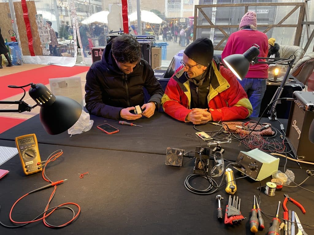 Car nous avons toutes et tous au fond du cœur, de notre placard ou de notre studio une question concernant l’électricité, un câble qui ne répond plus, une pédale d’effet HS, une guitare qui buzze, un petit synthé en kit pas fini de souder… Artefact propose aux artistes de redonner vie à leurs outils et instruments de musique chéris grâce à cet atelier de conseils, de fabrication, d’analyse de panne et de réparation électrique et électronique.