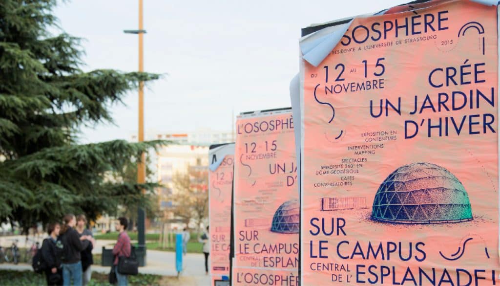 Invitée par l’Université de Strasbourg à faire étape dans sa bourlingue strasbourgeoise, L’Ososphère crée un éphémère Jardin d’Hiver sur le campus, fruit d’une résidence nourrie d’échanges avec ses interlocuteurs de l’université. Au programme : parcours artistique, projections immersives, interventions mapping, workshops, conversations publiques.