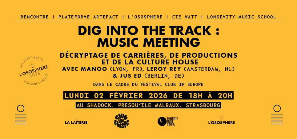 Parcours, inspirations, méthodes de production, coulisses de l’industrie musicale… chaque artiste partagera et décryptera la production de 3 morceaux clés pour retracer une part de l’histoire des musiques électroniques. Un temps d’échange ouvert, curieux et chaleureux, autour d’un verre. 🍸
