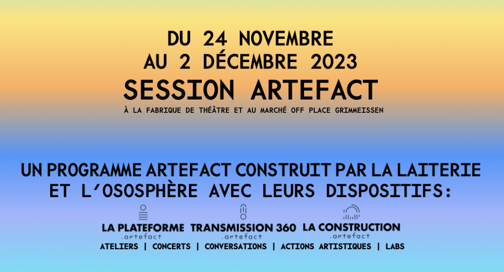 Articulée à son action artistique et programmatique à La Laiterie et sur L’Ososphère, Artefact développe depuis plusieurs années une intense activité qui croise accompagnement d’artistes et de projets, diagnostic sensible, transmission réciproque et médiation, participation des habitants et habitués. Une autre manière de faire ville ensemble, de vivre et partager l’expérience Artefact et de créer de nouveaux communs.