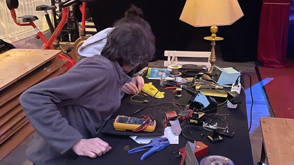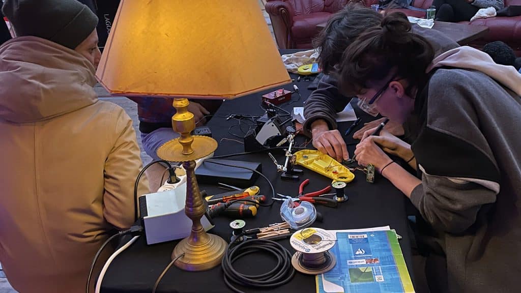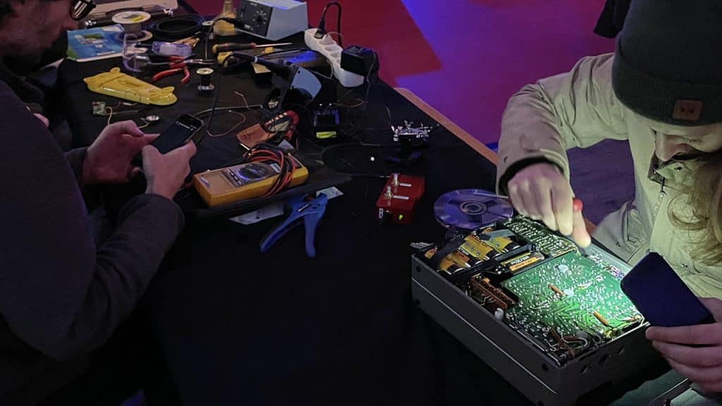 Lancé via La Construction, « L’Atelier Glitch » est un concept d’Artefact PRL imaginé et construit avec Gauthier Déplaude, artiste et concepteur d’objets électroniques sonores et visuels. Il s’agit de proposer un espace dédié à la réparation et création d’instruments analogiques et électroniques via la pratique et à la transmission, animé par l’esprit do-it-yourself, la lutte contre l’obsolescence programmée et la récupération. Le repair café propose aux artistes de comprendre et de redonner vie à leurs outils et instruments de musique : conseil, fabrication, analyse de panne et réparation électrique et électronique. En 2022, deux repair cafés ont été organisés hors les murs avec Gauthier Deplaude :