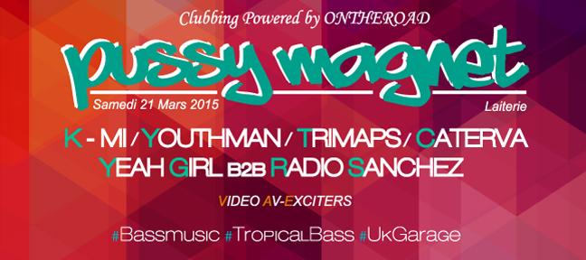 ON THE ROAD présente son deuxième Clubbing « PUSSY MAGNET » à la Laiterie. A cette occasion, le label strasbourgeois invite des artistes du collectif parisien « Get Tropical » (Youthman, K-MI, Trimaps), les Aficionados de bass music et de dubstep apprécieront. En exclu, CATERVA sera également de la partie avec un tout nouvel EP, accompagné par AV-Exciter pour un show mapping video inédit. (DR)