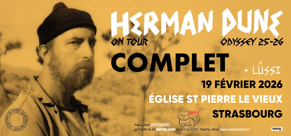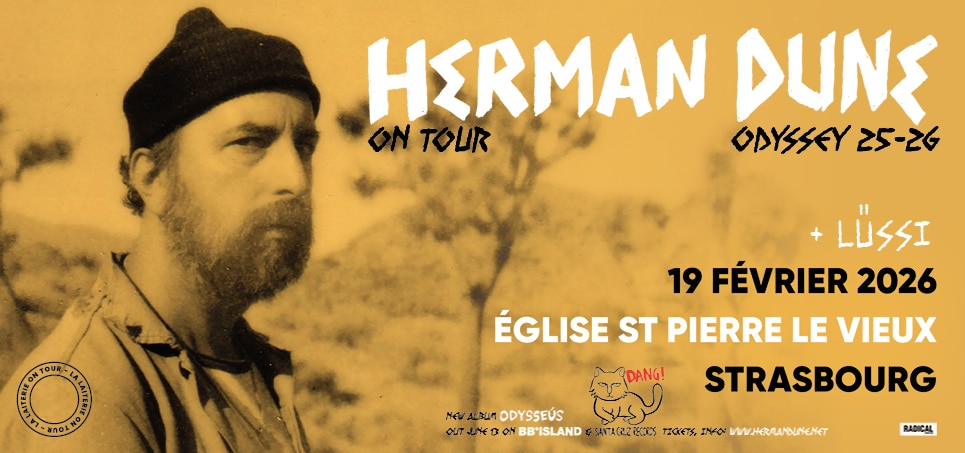Herman Dune, notre monument anti-folk national, le plus californien des songwriters français, présente « Odysseús », un voyage musical au fil de son existence tumultueuse. Rendez-vous pour une épopée live héroïque en solo à travers l’Europe et le Royaume-Uni, et notamment le jeudi 19 février 2026 à l’Eglise Saint-Pierre-le-Vieux, à Strasbourg.
