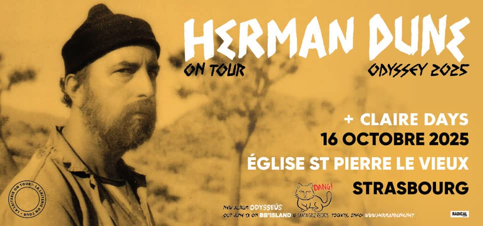 Das für den 16 october 2025 in der Eglise protestante Saint-Pierre le Vieux // NooToos Strasbourg geplante HERMAN DUNE Konzert wird abgesagt. Bitte kontaktieren Sie Ihre Verkaufsstellen für die Rückerstattung von Tickets vor den 16 december 2025.