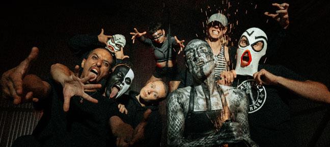 Un spectacle protéiforme, atypique et explosif, un rituel punk prenant vie sous les mots de rappeurs masqués et d’un trio guitare-batterie-mandoline, éclairé de performances pyrotechniques et d’acrobaties d’une voltigeuse aérienne. Un live inclusif en forme de transe collective où les spectateurs deviennent acteurs. Une aventure unique embrassée par un public fidèle aux 4 coins de l’Europe. Krav Boca : une troupe, un récit, un instant !