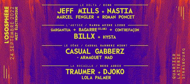 Das beliebte Ososphère-Festival kehrt zurück in das Viertel um die Laiterie und in die zwei Säle. Eine Nacht lang, am 24. September, gibt es auf vier Dance-Floors die großen Namen des Techno, House, Elektro sowie dem Hardcore, Frenchcore und der Subkultur Gabber . Auf der Programmliste stehen der legendäre Jeff Mills aus Detroit, Nastia, Billx, Djoko und Lola Palmer, um nur eine kleine Auswahl zu zitieren.