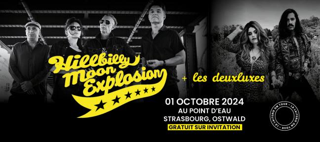 Freier Eintritt gegen Einladung. In Ostwald, dem Wilden Westen von Strasburg, erklingt Rockabilly, Rock’n’Roll, Blues und Swing Country Surf an der Wasserstelle von The Hillbilly Moon Explosion aus den Schweizer Bergen und les Deuxluxes aus den kanadischen Wäldern. Howdy an alle Cowgirls und Cowboys.