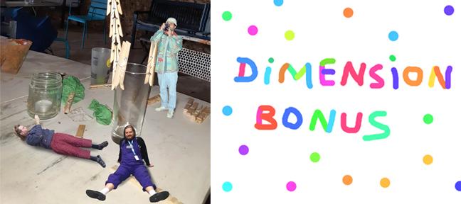 S’ils se sont d’abord fait connaître par leurs sautillants concerts avec les Salut c’est cool, s’ils forment avec leurs amis une sympathique tribu, DIMENSION BONUS doit surtout être considéré aujourd’hui comme un collectif artistique, qui évolue entre l’art du gros son, les voix fluettes de la poésie et le bricolage vidéo-numérique. Sous des allures désinvoltes, les 3 protagonistes (Louis, Vadim et Karolo) mènent une expérimentation poussée d’un art qui néglige le système de l’art contemporain, qui ignore les frontières du haut culturel et du bas populaire, du réel et du virtuel, de l’art et la vie pour reprendre le grand thème des avant-gardes artistiques du XXe siècle dont ils sont un prolongement à l’âge du post-internet et de You Tube. Pont manquant entre les rave-parties et le Dadaïsme, le collectif vante sa liberté jouissive et déconcertante à travers leur performance qui devient un hymne censé au monde, à la nature, aux objets, aux formes, aux gens, à tout.