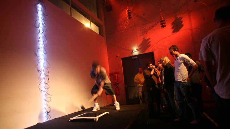 8-bit kermesse dialogue tant avec La Laiterie qu’avec ceux – spectateurs, artistes, acteurs et autres artefacts – qui habitent ses espaces publics et ses fantasmatiques arrière-scènes. Point de départ idéal pour cette série d’interventions artistiques sur notre salle, cette installation augmente le lieu de lui-même, à la faveur de l’action de ses spectateurs et réserve aux plus physiques d’entre eux de le révéler dans sa complétude par la grâce d’un rapport homme-machine des plus bruts.