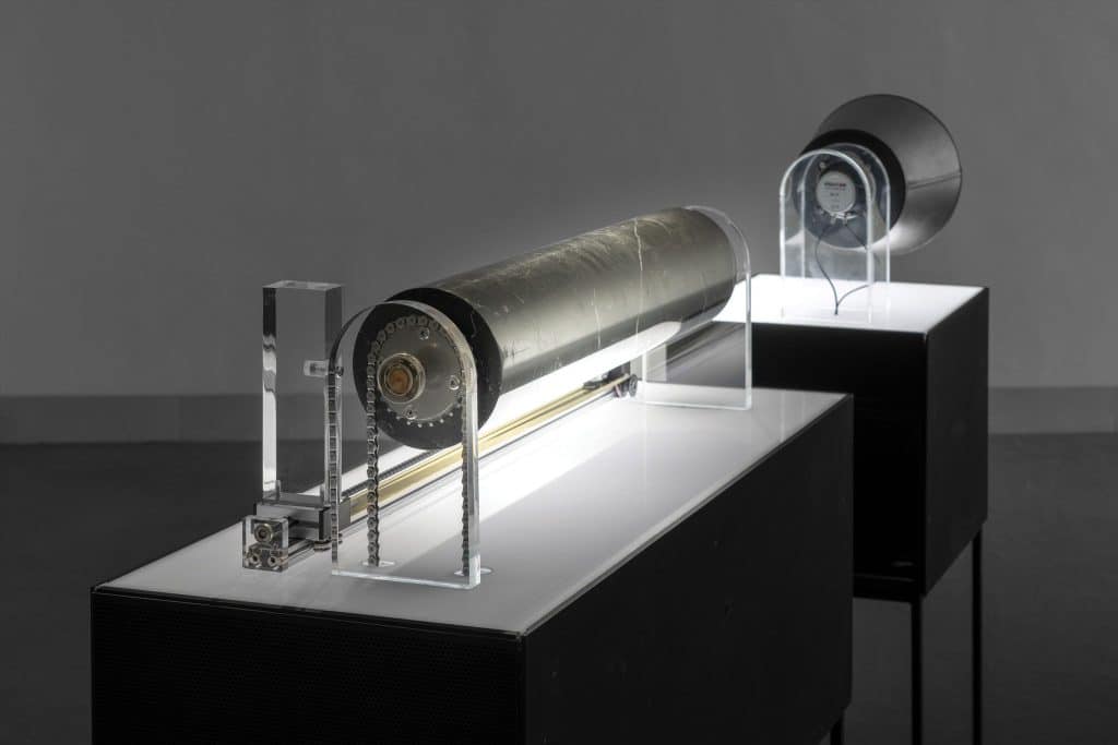 Artefact#0, Digital Necrophony interroge l’existence d’un au-delà numérique et les formes de communication possibles avec celui-ci. Cette installation inspirée du gramophone à cylindre d’Edison, détourne son dispositif pour tenter de capter des messages d’une autre dimension.