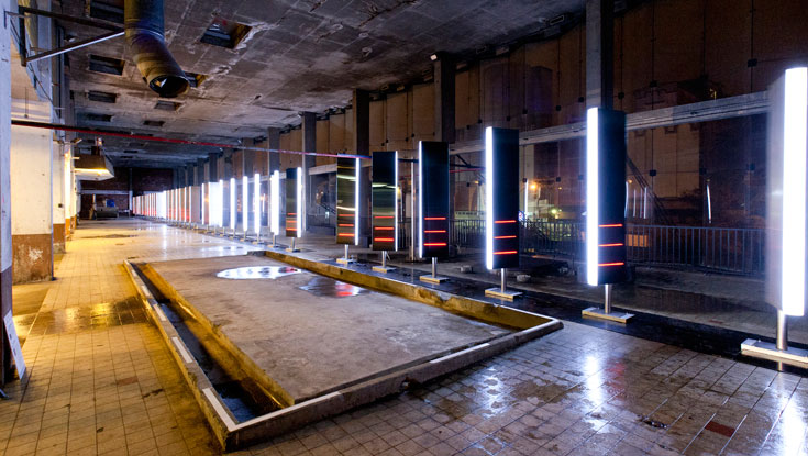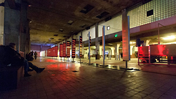 Binary Waves constitue une installation cybernétique qui se base sur la détection des flux et leur transcription en principes lumineux, sonores et cinétiques, déployés sur une monumentale série de panneaux. Ceux-ci tournent sur leur axe vertical, créant des effets alternant entre réflexion et illumination. Spectaculairement contemplative, incarnant et donnant à voir les systèmes de flux dans lesquels nous traçons notre chemin, Binary Waves constitue un miroir de la vie urbaine. L’installation révèle dans le même temps son environnement : l’impressionnant volume de la salle dans laquelle elle évoque une chaîne de production d’une nouvelle donne industrieuse et le splendide spectacle immobile du port que révèle la vitre monumentale dont elle traverse le champ.