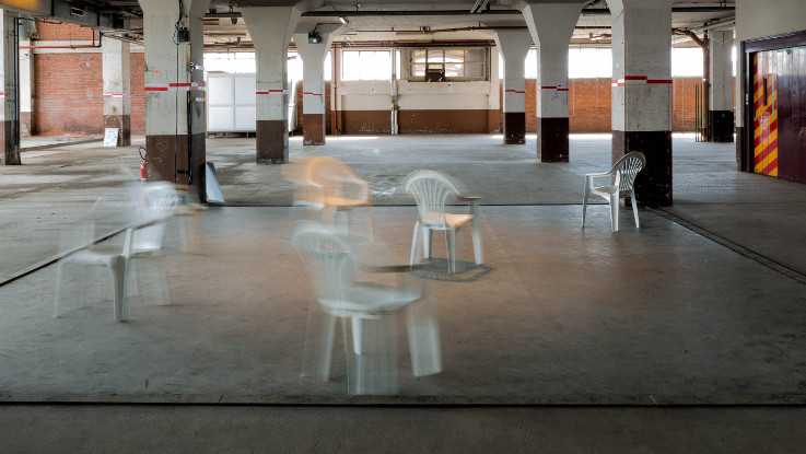 Quelques chaises de jardin vibrent et se déplacent doucement, tournant au hasard dans l’espace, au son d’un bourdonnement continu. Elles semblent se chercher et se fuir en même temps. Lorsqu’un visiteur passe ou qu’il s’assied, les chaises hésitent, cherchent d’autres configurations. Les motifs ne sont pas prédéfinis, le système s’auto-organise, de nouvelles compositions et comportements adviennent tout au long de l’installation qui renvoie inlassablement au jeu de nos conversations.