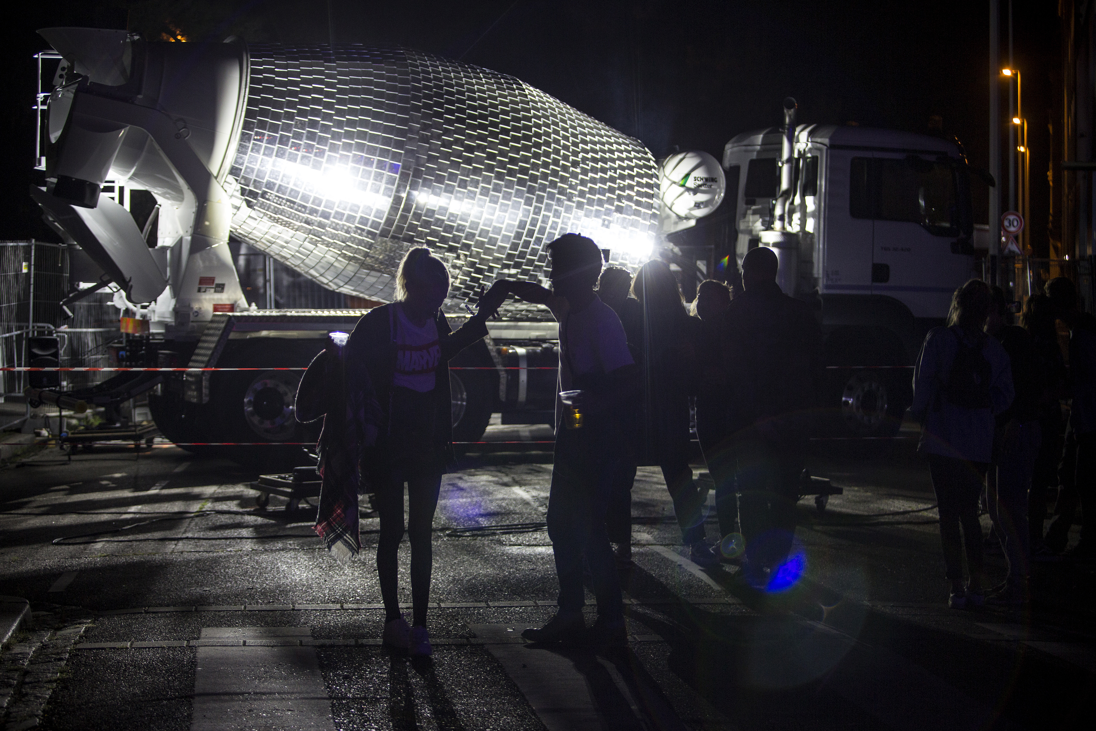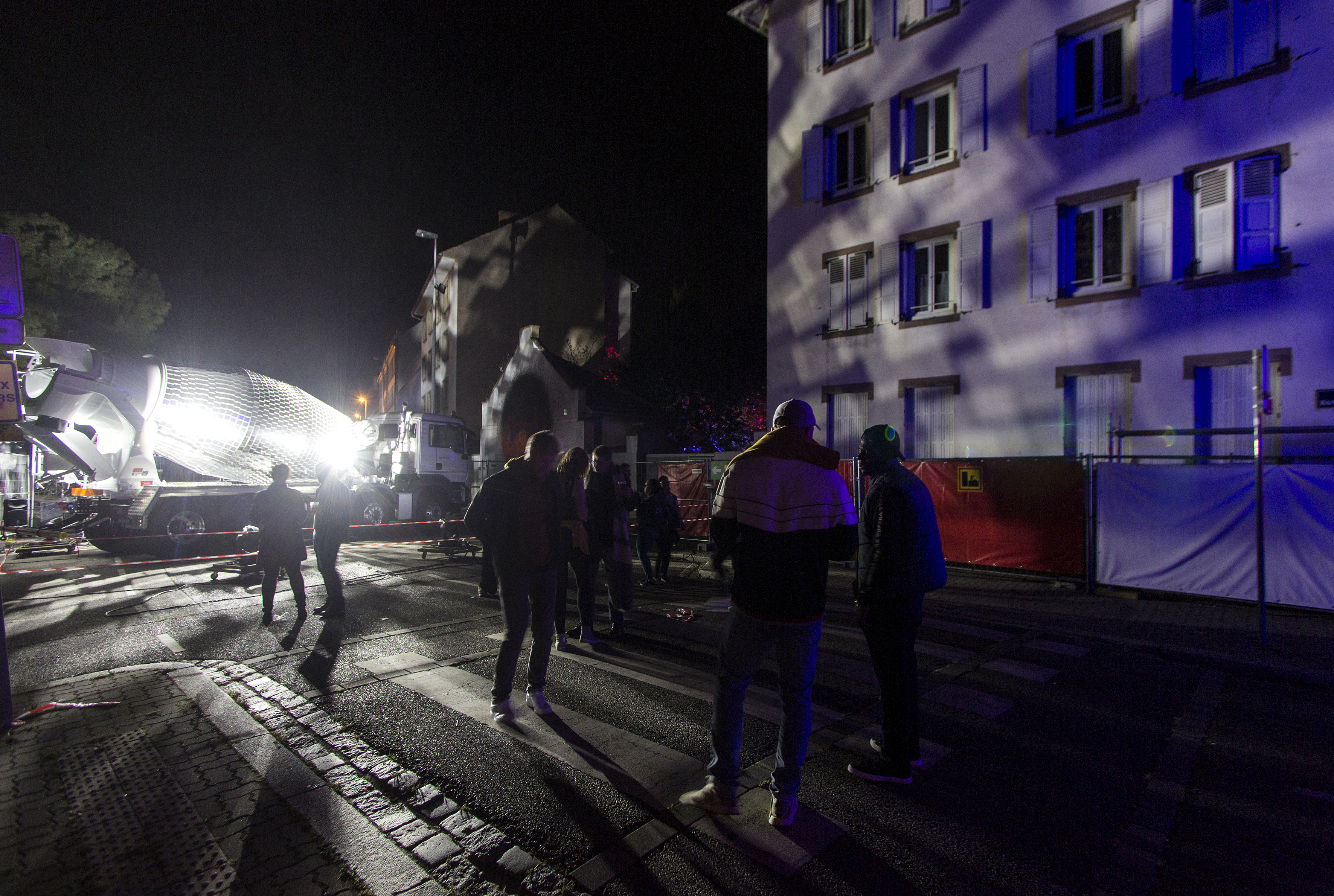 L’œuvre « La bétonnière boule à facettes » de Benedetto Bufalino incarne cette événementialisation de l’espace urbain par les travaux au cœur de la ville et les ressources de ré-enchantement du quotidien que le chantier recèle au-delà des incontournables nuisances qu’il provoque. A la fois poétique, dynamique et humoristique, elle tient des arts visuels contextuels, du street-art, du dispositif artistique lumineux, de l’intervention dans l’espace public, de la proposition artistique participative…