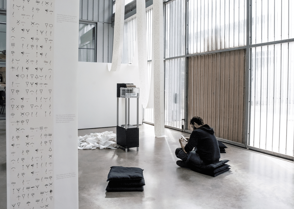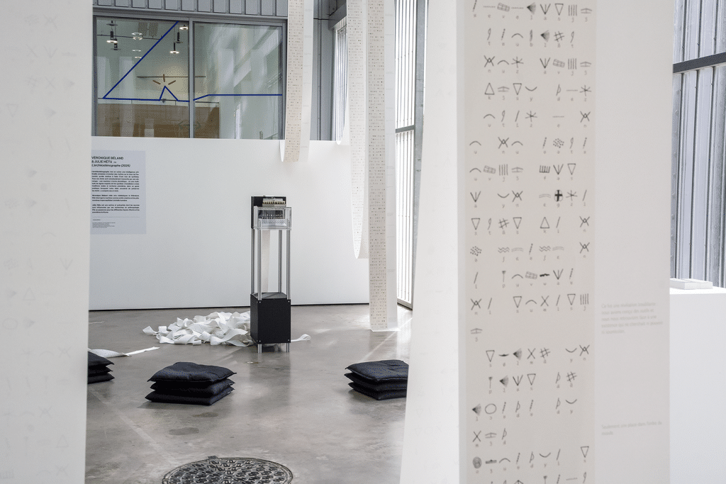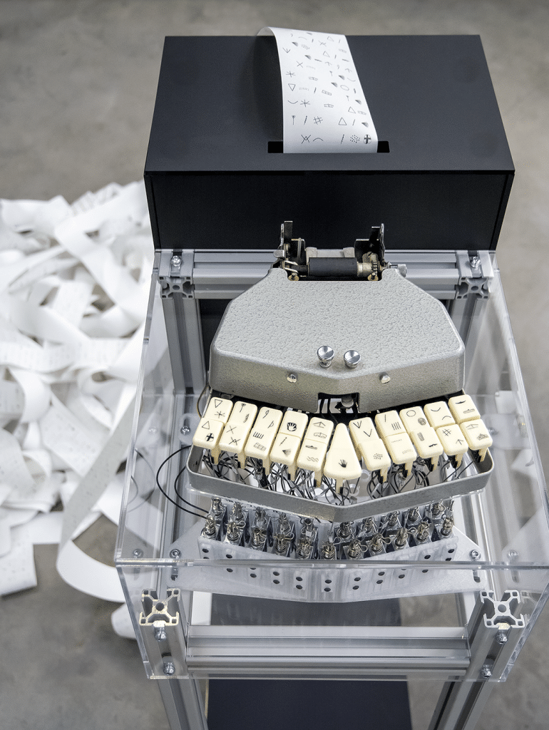L’archéosténographe est une installation générative dans laquelle une IA invente des mythes sur le futur de l’humanité, oralisés par une voix de synthèse. Ces récits, familiers par leur ancrage dans l’inconscient collectif, sont transcrits en temps réel en signes préhistoriques par une sténotype robotisée, archivant ainsi des histoires orales.