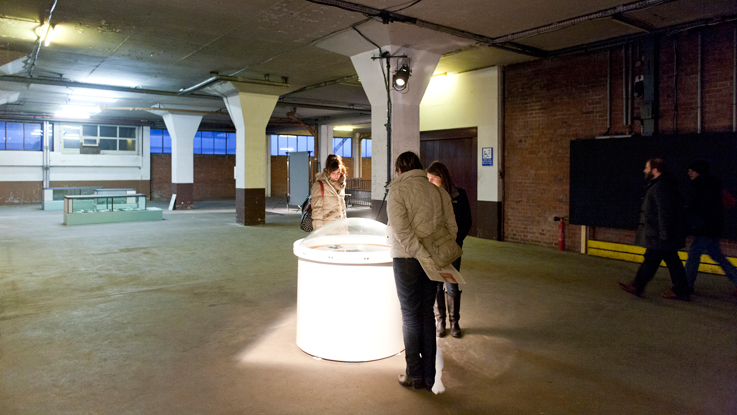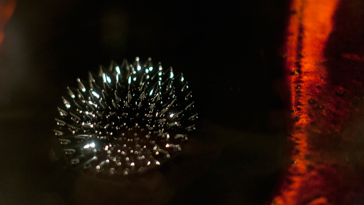 Protégée sous un dôme de verre, une forme à la géométrie parfaite émerge d’un liquide noir et épais. Cette entité sombre est capable de se mouvoir, vibrante, elle semble s’échapper ou s’approcher de ses visiteurs. Dans une esthétique teintée à la fois de technologie et d’ésotérisme, Mercure Noir se joue de nos croyances personnelles ; au cœur du vis-à-vis avec le terminal portuaire que propose le lieu où elle est installée, elle amène une évocation des matières qui y transitent.