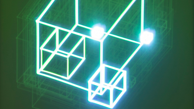 Un tableau phosphorescent totalement vierge sur lequel sont dessinés des motifs graphiques par un faisceau laser.
