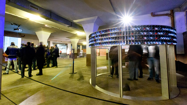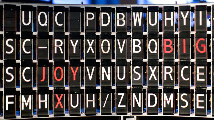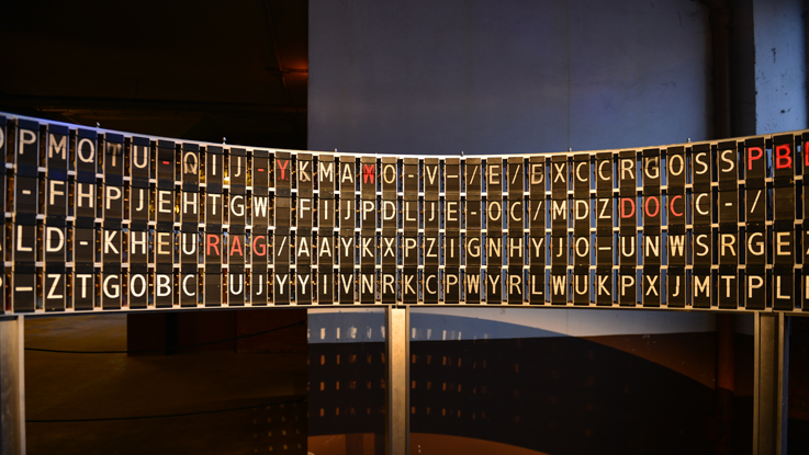 Cette installation cinétique confronte le spectateur à des motifs graphiques et sonores. Elle invite le visiteur à plonger dans une composition cinétique : des split-flaps tournent sur un rythme variable, analysant dans la masse de caractères arrangés aléatoirement et systématiquement, l’apparition de mots qui ont un sens.