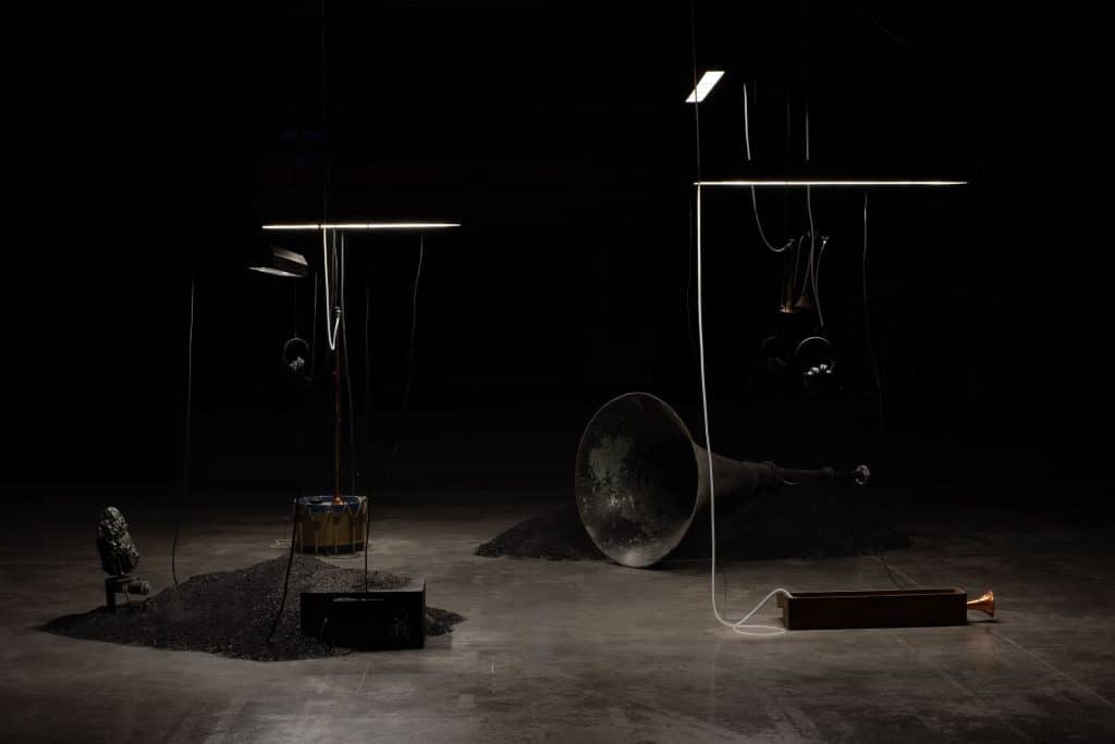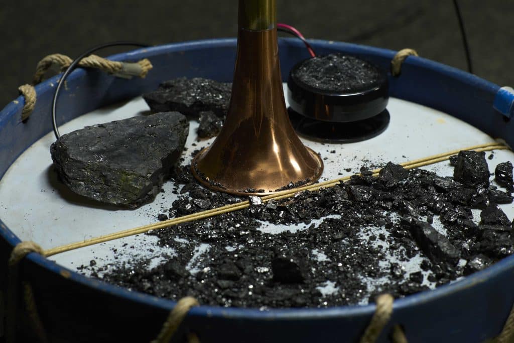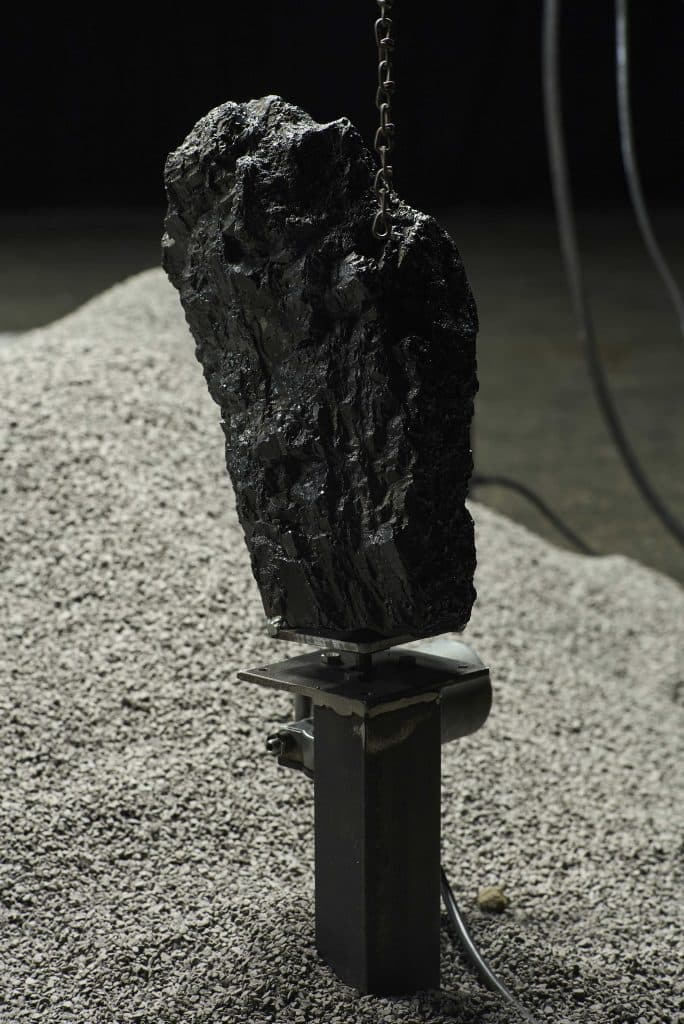 L’installation rassemble plusieurs dispositifs sonores, tous contrôlés par une même archive réalisée à partir de prises de son sur différents sites miniers ; elle donne ainsi forme à des forces qui les habitent, qu’elles soient géologiques, humaines, animales ou électromagnétiques.