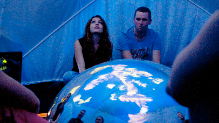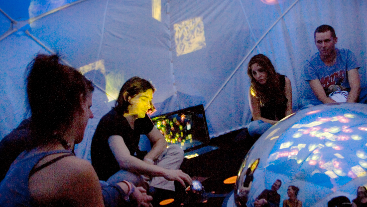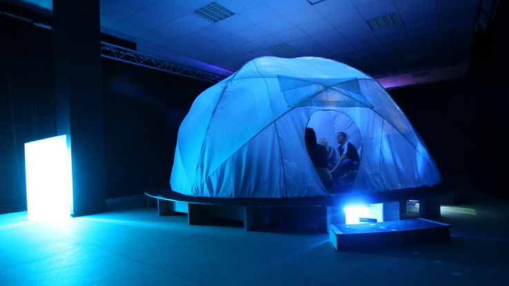 SphèrAléas est un espace immersif, évolutif et interactif. Au sein d’une demi-sphère, une relation entre l’homme, l’image et le son est mise en jeu. Propice à des performances collectives, SphèrAléas est un espace de création onirique dans lequel le public crée, manipule, juxtapose, superpose des formes lumineuses audibles, instables et réactives pour composer des microcosmes visuels et sonores. À l’intérieur, impliqué dans une expérience communautaire, le public assis ou allongé peut activer les capteurs sensoriels ou simplement se laisser aller à la rêverie. Il peut ainsi intervenir continuellement sur la structure globale en jouant sur différentes variations : ordre, juxtaposition, superposition, vitesse, rythme, hauteurs harmoniques… En mêlant ces structures visuelles et sonores, les spectateurs créent ensemble, tel un orchestre, des symphonies à contempler.
