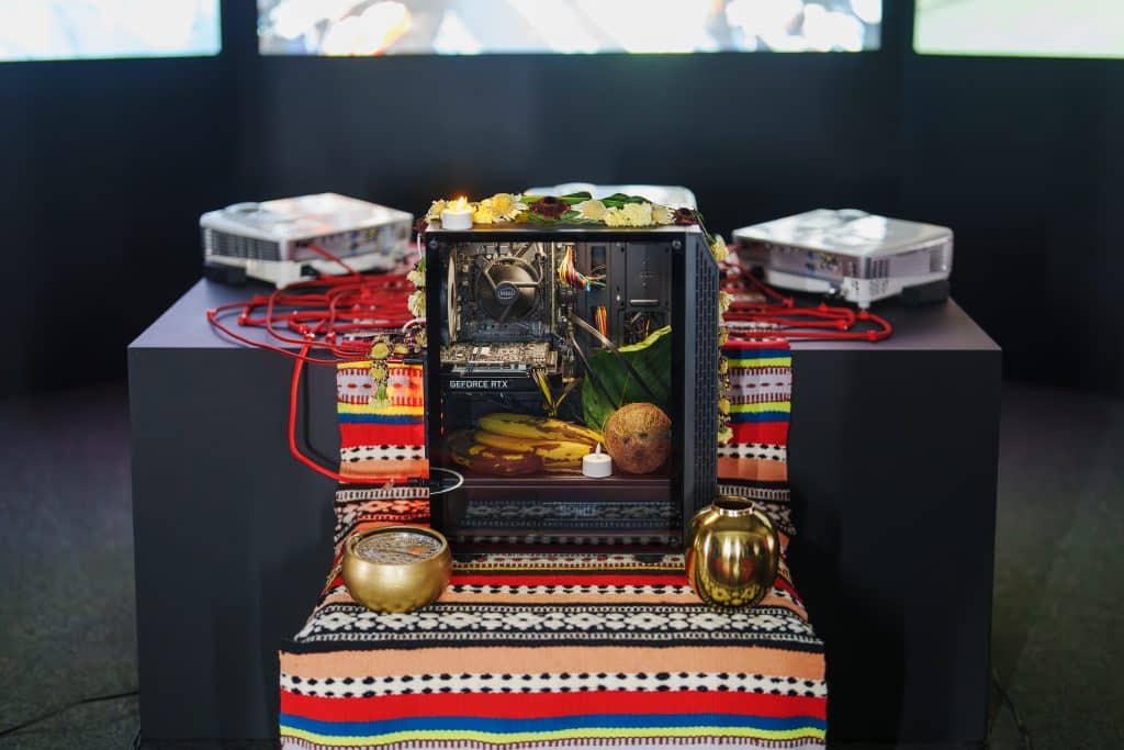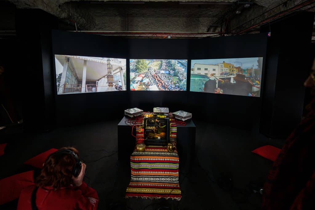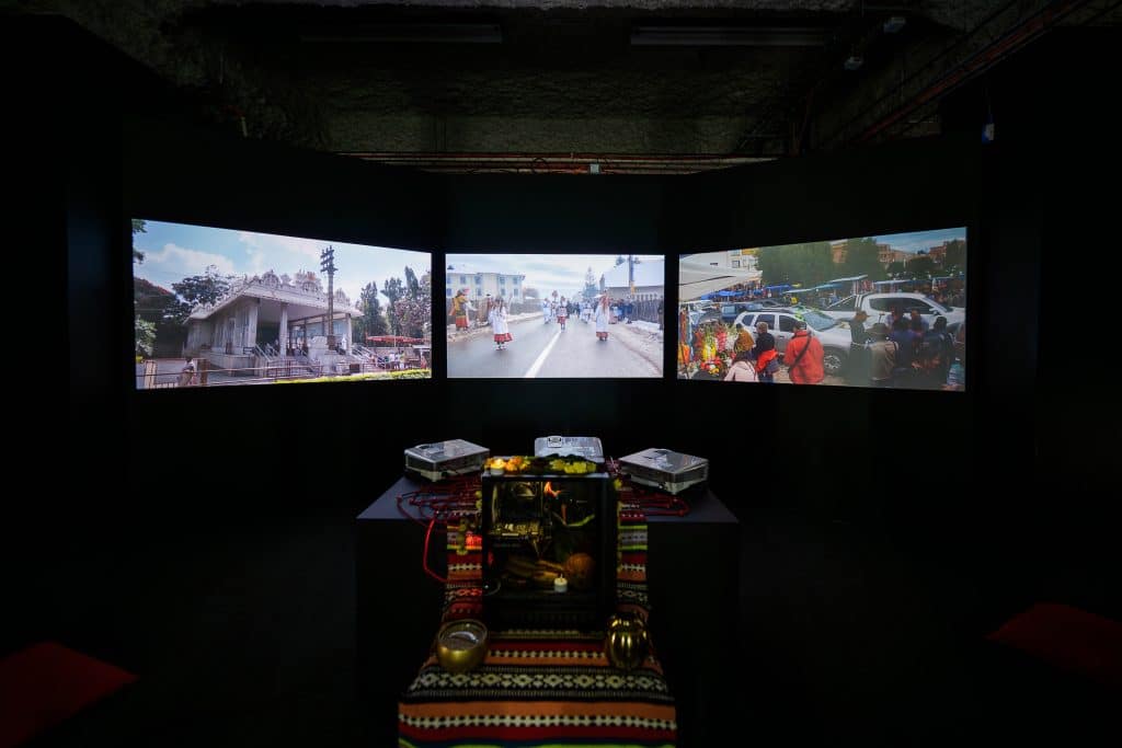 Triptyque vidéo présentant Drone Puja, La Vierge de Copacabana et La Danse des Ours, Spiritus Tutelaris en appelle à intégrer les machines et outils du quotidien dans les pratiques de ritualisation, notamment celles liées à la protection, quitte à converser avec les pratiques ancestrales que la course à la modernité n’aura pas éradiquée.