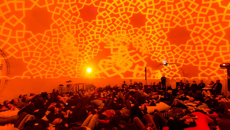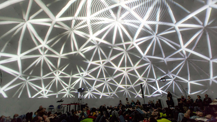 Créé spécifiquement pour ce dôme qui est au cœur même de son concept, Synergetics est un projet intégrant l’idée de Buckminster Fuller relative à un nouveau mode de pensée tridimensionnel, dépourvu des lois classiques orthonormées XYZ. L’icosaèdre est au cœur de ce processus et cette interprétation audiovisuelle au sein d’une surface pixellaire hémisphérique nous permet de voyager à travers les concepts de géodésie et de tenségrité, permettant ainsi la métamorphose géométrique de la voûte du dôme et de ces déclinaisons architecturales.