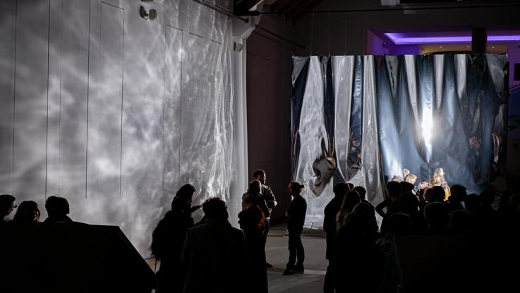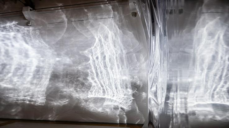 Un grand volume fluide nous surplombe. Un volume dont la perception serait proche de celle d’une grande masse d’eau en suspension dans l’espace. Le volume apparaît comme un « ghost », résultant d’une présence physique proche de l’immatériel. Comme contraint dans sa verticalité, il est, par ailleurs, animé en son sein de perturbations, de turbulences, de réflexions, caractéristiques des effets de la lumière au contact de l’eau en mouvement. Dans Turbulences, Étienne Rey engage le récit dans son geste plastique. Comme dans une anticipation de moins en moins improbable, il convoque l’écriture numérique et la machinerie pour recréer une expérience poétique universelle, autant qu’intime et située, celle de l’abandon à la contemplation du jeu de la lumière sur l’eau. Geste doux et désespéré d’un artiste pour sauvegarder une émotion qui pourrait disparaître avec l’évaporation des conditions naturelles qui nous l’offrent.
