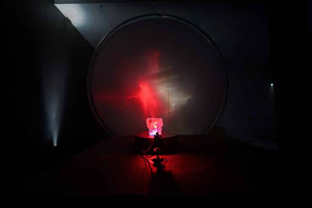 Univerre, création in situ présentée par les artistes Stéphane Kozik et François Delamarre en duo, reprend les procédés utilisés parModema Perception et Roboscope, à savoir des capteurs et des lasers pour créer des paysages de lumière mouvants et contemplatifs à partir d’objets sculptés en verre. Côté sonore, l’ordinateur dialogue avec le synthétiseur modulaire, le numérique enlace l’analogique. Deux écritures, deux respirations qui se répondent et se complètent. À travers cette œuvre, les deux artistes entrent en résonance, dialoguent en symétrie et fusionnent leurs langages pour composer un seul tableau né de la rencontre de leurs deux territoires.
