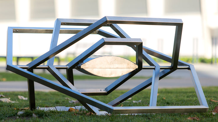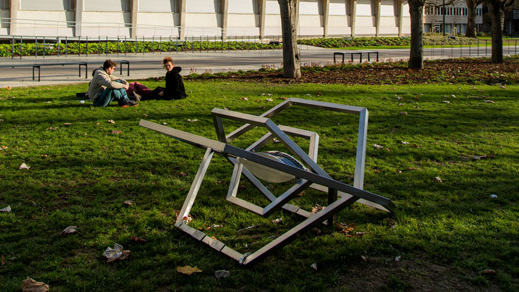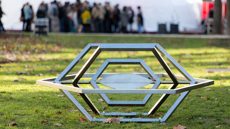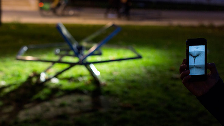 Le projet Utopia joue sur la construction d’un non-lieu, d’un lieu autre, et expérimente les capacités de déploiement d’une forme grâce aux nouvelles technologies. Utopia propose d’implanter au centre du campus un espace virtuel qui incarne ses augmentations dématérialisées. Sculpture momentanément posée dans le parc, elle est à mi-chemin entre un repère géodésique et un objet spatial revenu à terre. Grâce à sa fonction d’antenne, Utopia installe son propre réseau wi-fi dans ce Jardin d’Hiver « naturellement » connecté. L’onde émise est travaillée comme une architecture virtuelle à visualiser sur un smartphone ou une tablette.