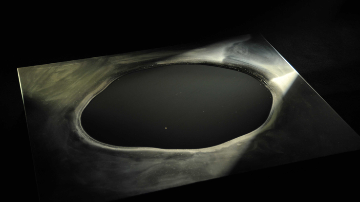 Une surface noire rectangulaire légèrement surélevée du sol. Au centre de la surface une flaque noire. De temps à autre, une goutte d’eau se fait entendre. Celle-ci n’a d’autre existence que sonore.