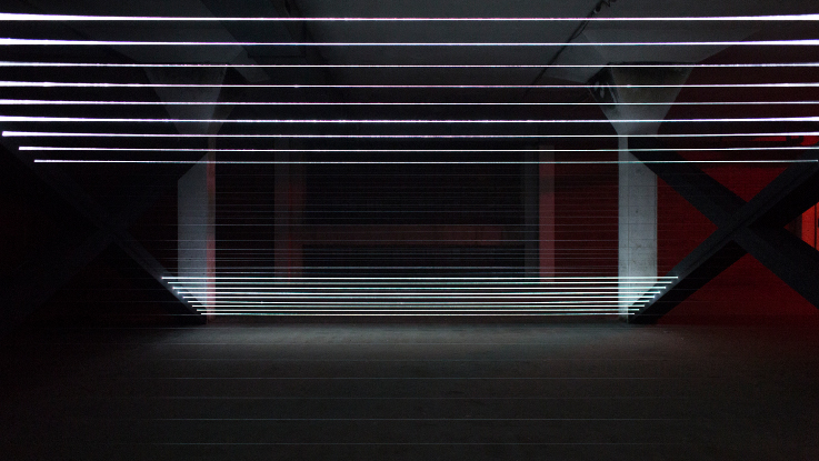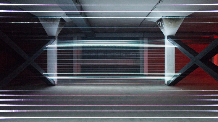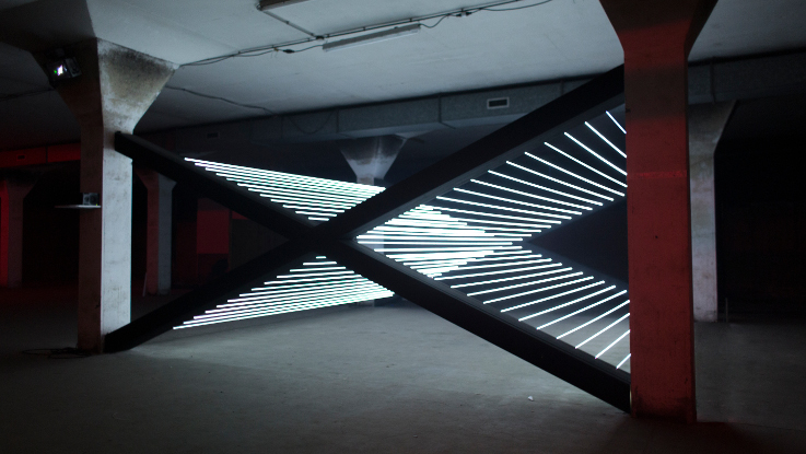 La structure géométrique simple de cette installation audiovisuelle est formée de fibres optiques et propose une chorégraphie de lumière.