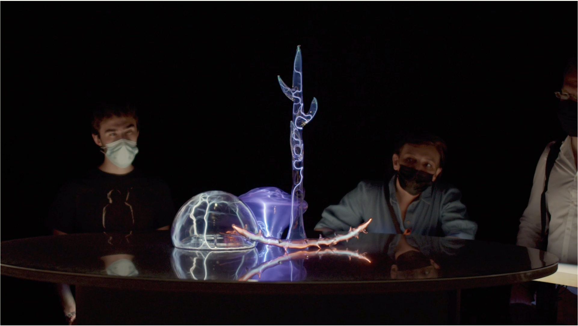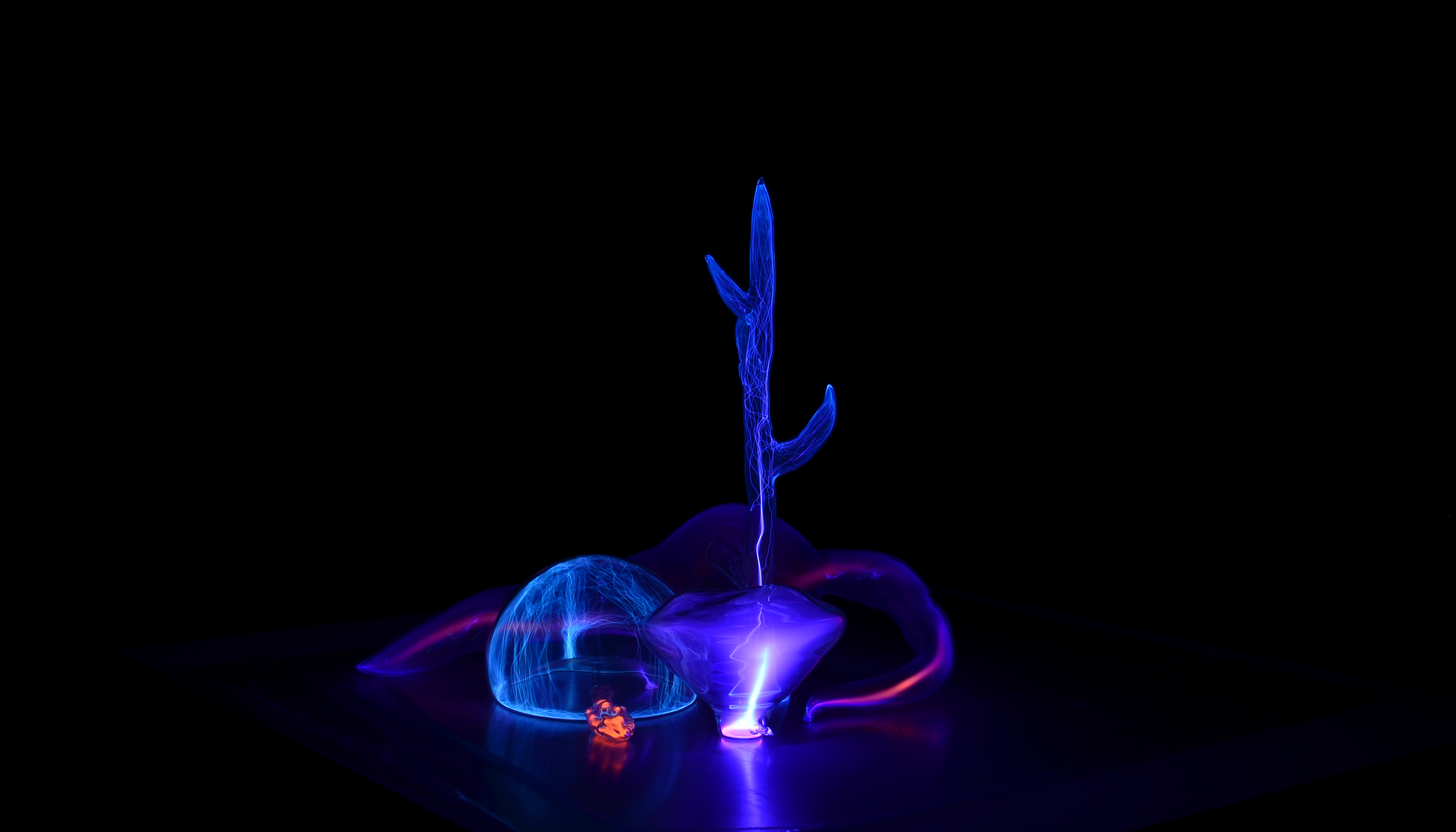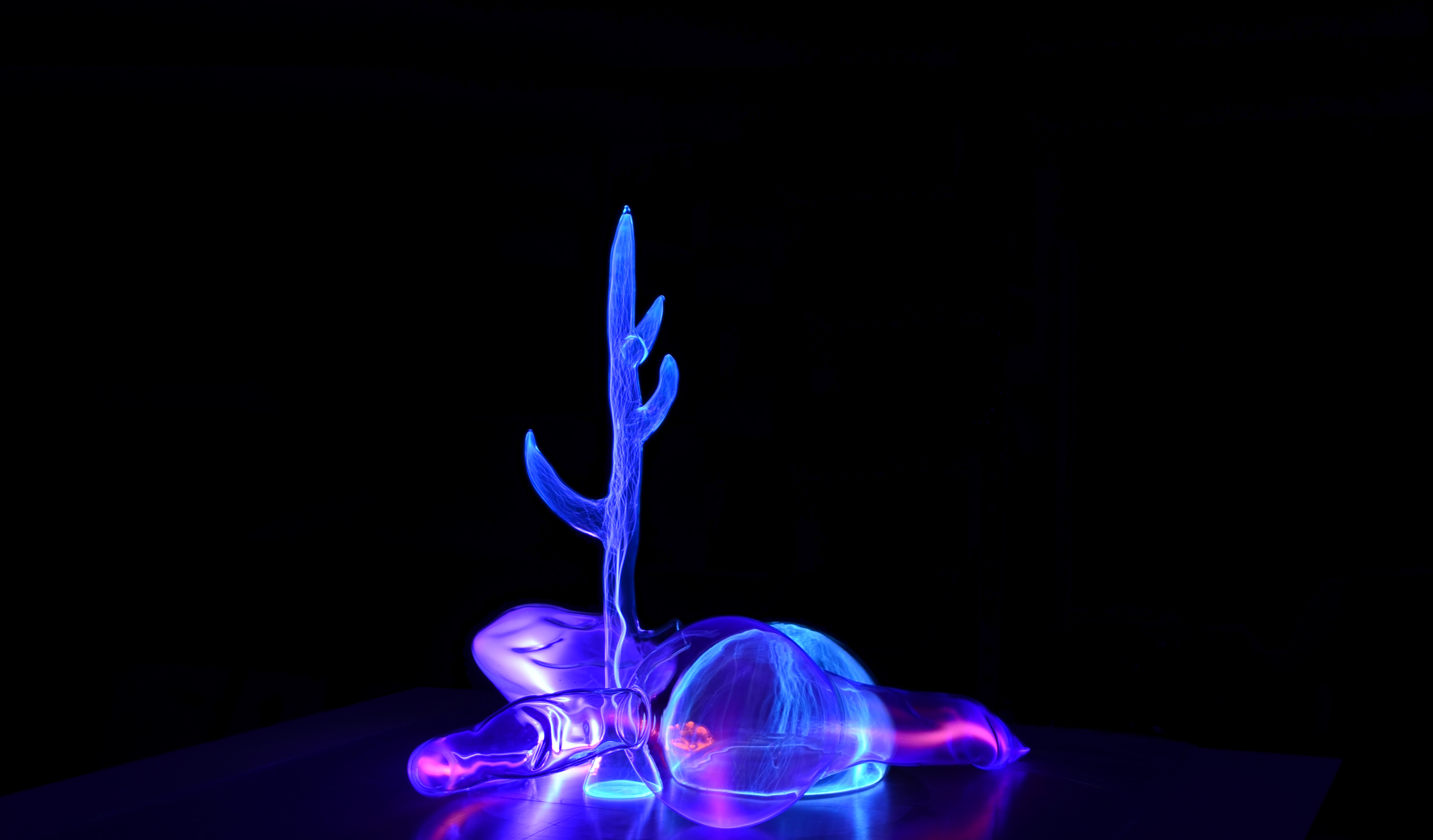 Six objets reposent au centre d’un grand disque plat. Leurs formes rappellent tant les dispositifs scientifiques que des structures organiques ou magmatiques. Chacun de ces objets donne à voir une matière-énergie, de teinte et de structure à nulle autre égale. Ils sont en effet emplis des gaz qui composent le milieu interstellaire : argon, néon, krypton, xénon, nitrogène… et sont tissés de la même étoffe que le soleil : le plasma.